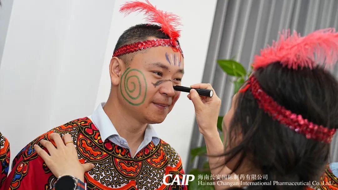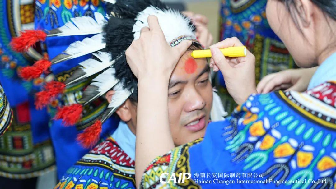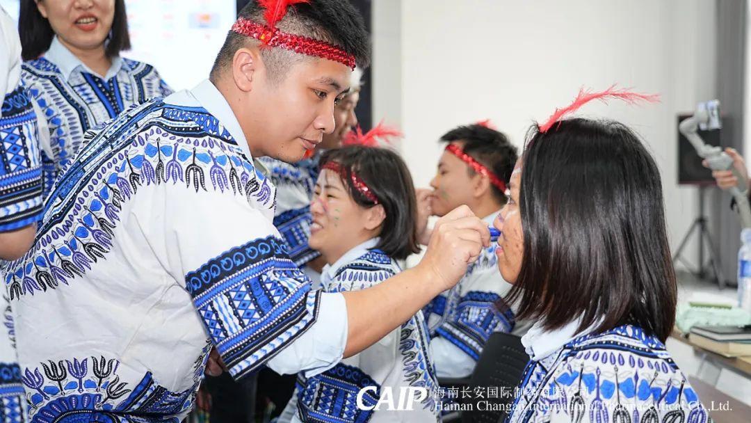 緊接著,全體骨干分為四個(gè)部落,選舉酋長、王妃和舞姬,開啟族內(nèi)建設(shè),取族名、立口號(hào)、擺隊(duì)形,并換上非洲當(dāng)?shù)氐难b扮——頭戴羽冠、特色服飾,用特殊的油彩繪制出專屬部落五彩斑斕的精致臉譜。