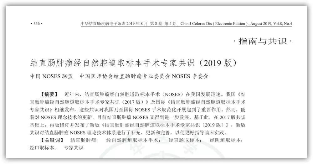 近年來,結(jié)直腸腫瘤NOSES更新速度非???,其理論技術(shù)體系也發(fā)生很大變化,2017年發(fā)布的《結(jié)直腸腫瘤經(jīng)自然腔道取標本手術(shù)專家共識(2017 版)》中很多內(nèi)容也無法滿足目前NOSES手術(shù)的臨床需要?;诖耍袊t(yī)師協(xié)會結(jié)直腸腫瘤專業(yè)委員會 NOSES 專委會及中國NOSES 聯(lián)盟的數(shù)十位專家,在 2017 版共識的基礎(chǔ)上,共同再版起草了《結(jié)直腸腫瘤經(jīng)自然腔道取標本手術(shù)專家共識(2019 版)》(以下簡稱《共識》)。